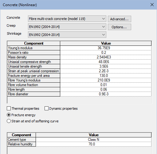 Our advanced plastic-damage-contact formulation captures the true behaviour of fibre-reinforced concrete. Evaluate cracking, creep, shrinkage and crushing in one model. Model behaviour in full 4D, as deformations, stresses and cracks develop with time. Use to assess curing of FRC components from casting to old age by combining with our hygro-thermal facility.